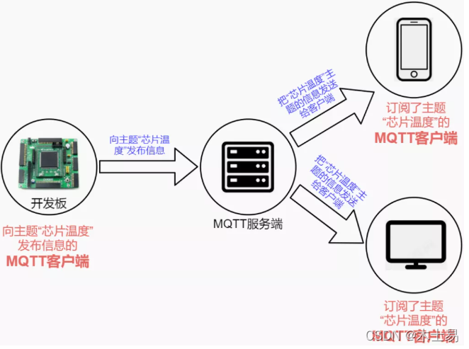 以上实例中,开发板是“芯片温度”主题的发布者,而手机和电脑则是该主题的订阅者。
