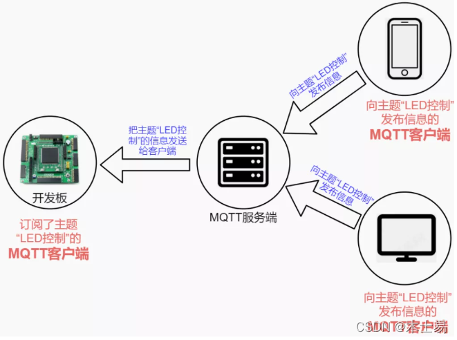 上图中的所有客户端都是围绕“LED 控制”这一主题进行通信。此时,对于“LED 控制”这一主题来 说,手机和电脑客户端成为了 MQTT 信息的发布者而开发板则成为了 MQTT 信息的订阅者(接收者)。
