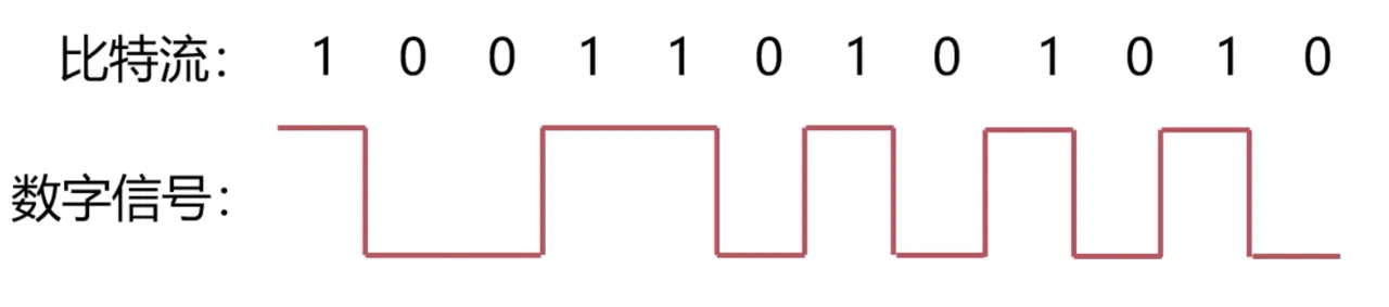 「由高低电频表示的数据流,1 => 高电频,0 => 低电频」,例如由比特流 100110101010 转化成的数字信号如下图所示: