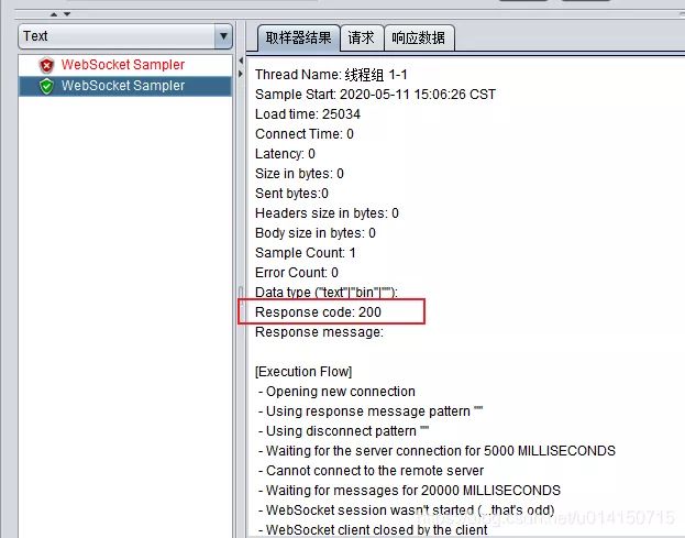 循环中的sampler都勾选了streaming,最后一个sampler没有勾选此选项,结果中可以看出:在loop controller中的sampler使用的是一个连接,在loop外面的这个sampler会打开一个新的连接,可以得出一个结论,实际上,当勾选了streaming connection时,不仅会在结束会话后保留连接,而且勾选了的sampler会在有可用连接是直接使用,而没有勾选的sampler即使存在可用连接也会重新打开一个新的连接。因此,如果是要在一个会话中发送多条消息,请勾选这个streamingconnection