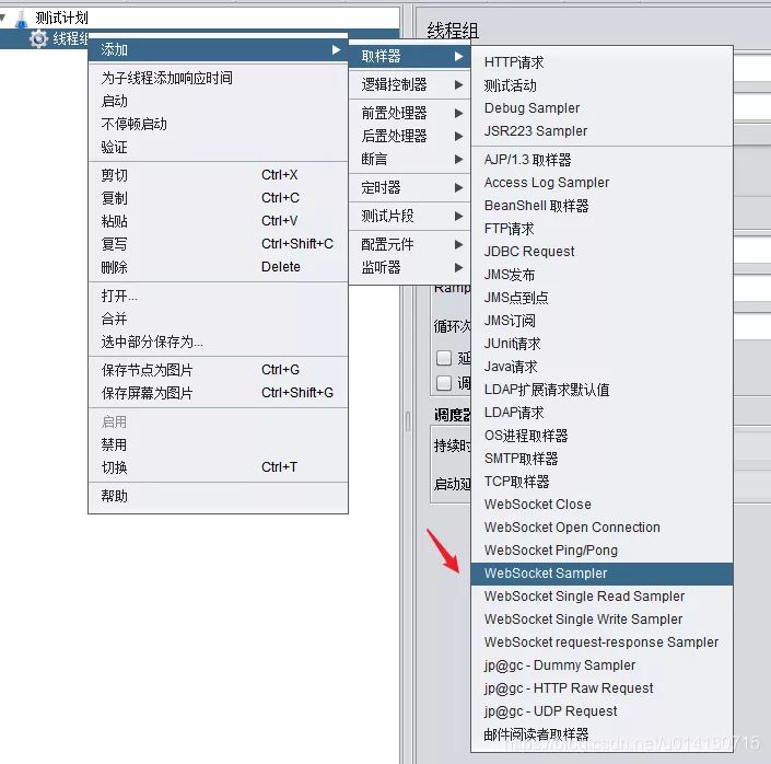 重启jmeter 后,添加线程组,右键添加取样器,会出现WebSocket 相关插件