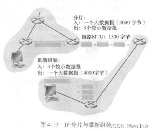 片在其到达目的地运输层以前需要重新组装。TCP与UDP的确都希望从网络层收到完整的、未分片的报文。IPv4的设计者感到在路由器中重新组装数据报会给协议带来相当大的复杂性并且影响路由器的性能。为坚持网络内核保持简单的原则,IPv4的设计者决定将数据报的重新组装工作放到端系统中,而不是放到网络路由器中。