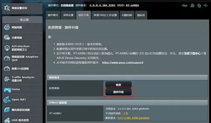 最后说一下路由器的固件更新,目的是增强路由器的性能和修复已知的问题。在一般设置的界面,切换至【网络地图】-【固件升级】,升级期间切记不要关闭路由器哦~