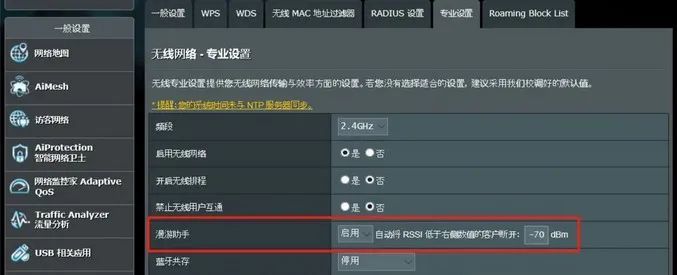 第三步:回到无线网络界面,点击【专业设置】,选择频段后将【漫游助手】设置为【停用】,当然,你也可以将其数值设置为【-50dBm】。