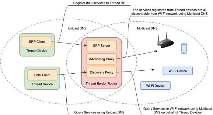 Thread 边界路由器还实现了 DNS-SD 发现代理 (Discovery Proxy),这样 Thread 设备也可以发现 Wi-Fi 网络中的服务。