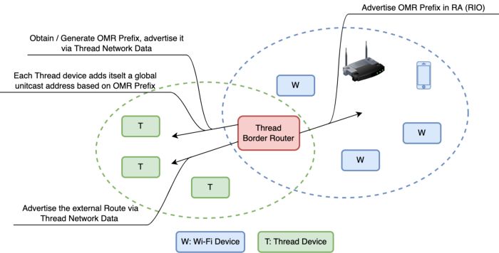 Thread 边界路由器为其所在 Thread 网络配置 OMR (Off-Mesh Routable) Prefix,每个 Thread 设备相应添加一个 OMR 地址作为全局单播地址。Thread 边界路由器通过向 Wi-Fi 网络发送包含 IPv6 Route Information Option (RIO) 的 Router Advertisement (RA) 数据帧,来宣布此 OMR Prefix 可抵达 Thread 网络。