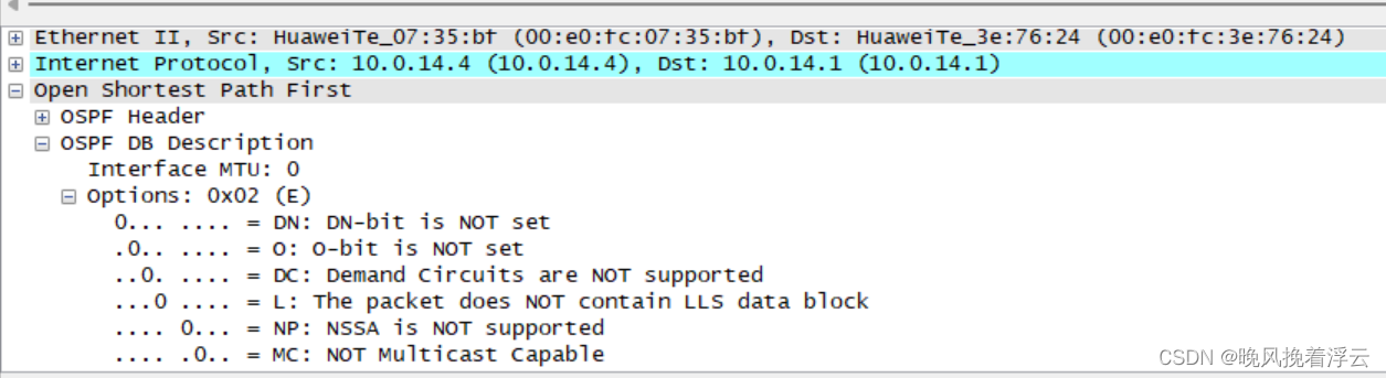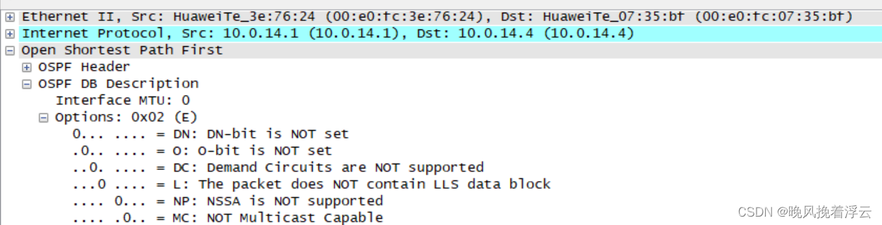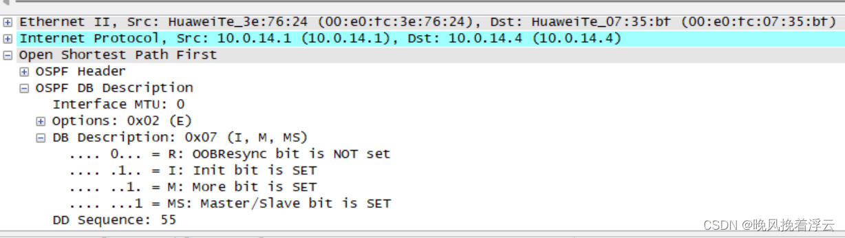 可以发现首次交互的DD报文,其中一位、M位、MS位都设置为1。R1和R4都宣称自己为主路由器。这两个DD报文是不包含数据库摘要信息的。首次DD报文交互后,便可选举出Router-ID较大的R4为主路由器。