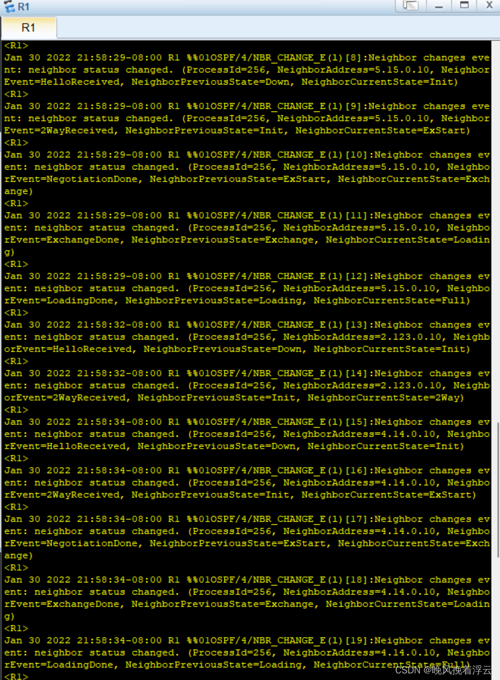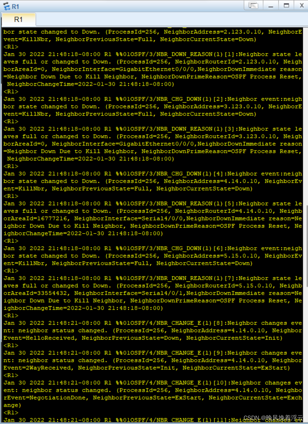 在路由器R1上重启OSPF进程,通过Debugging调试观察OSPF邻居关系的建立过程。