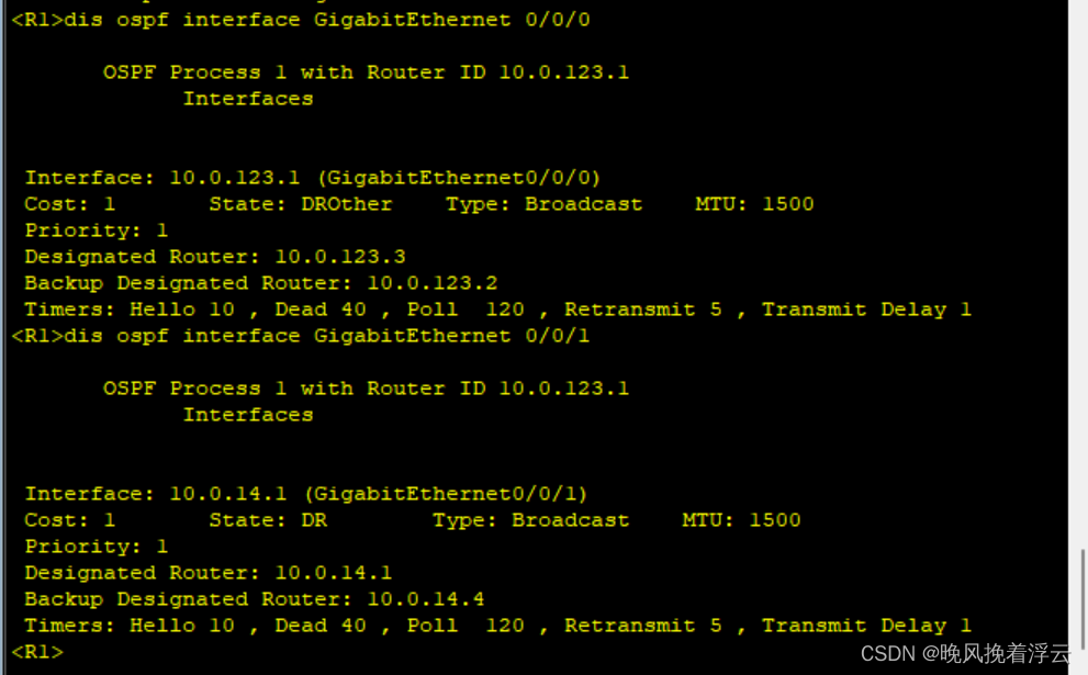 在R1上查看广播型网络接口G0/0/0和点到点网络接口G0/0/1的详细信息