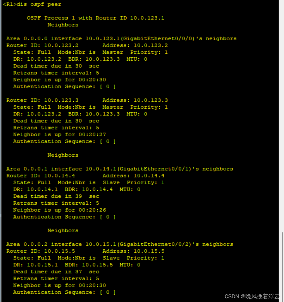 可以看到,包含R1,R2,R3的广播网络已经完成了DR/BDR的选举,选举结果如图所示,10.0.123.2(R2)为DR,10.0.123.3(R3)为BDR。R1和R4之间,R1和R5之间的两个点到点网络都没有进行DR/BDR的选举。