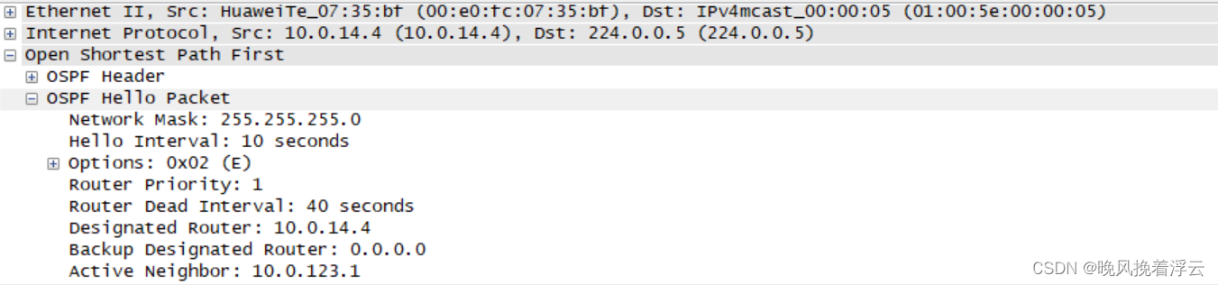 可以看出Hello报文中,包含了很多基本信息,例如,子网掩码为24位,Hello间隔时间为10s,路由器死亡时间间隔为40s,网络上没有DR和BDR。另外,R4发布的Hello报文中指出了活跃邻居为R1,这说明R1和R4成功建立了OSPF邻居关系;