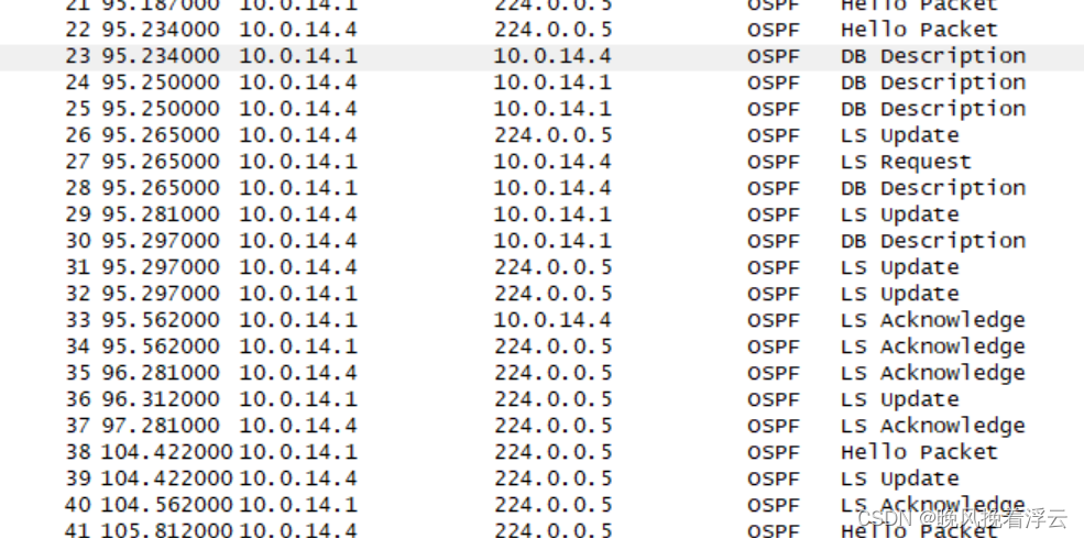 从图中我们可以观察到OSPF协议的各种数据报文,它们反映LSDB的同步过程,同时也反映了OSPF邻居邻接关系建立的过程:首先,R1(10.0.14.1)和R4(10.0.14.4)通过Hello报文进行协商,然后通过数据库描述(DD:Database Description)报文、链路状态请求(LSR:Link State Ruquest)报文,链路状态更新(LSU:Link State Update)报文等,最终实现了LSDB的同步,并建立起OSPF邻接关系。