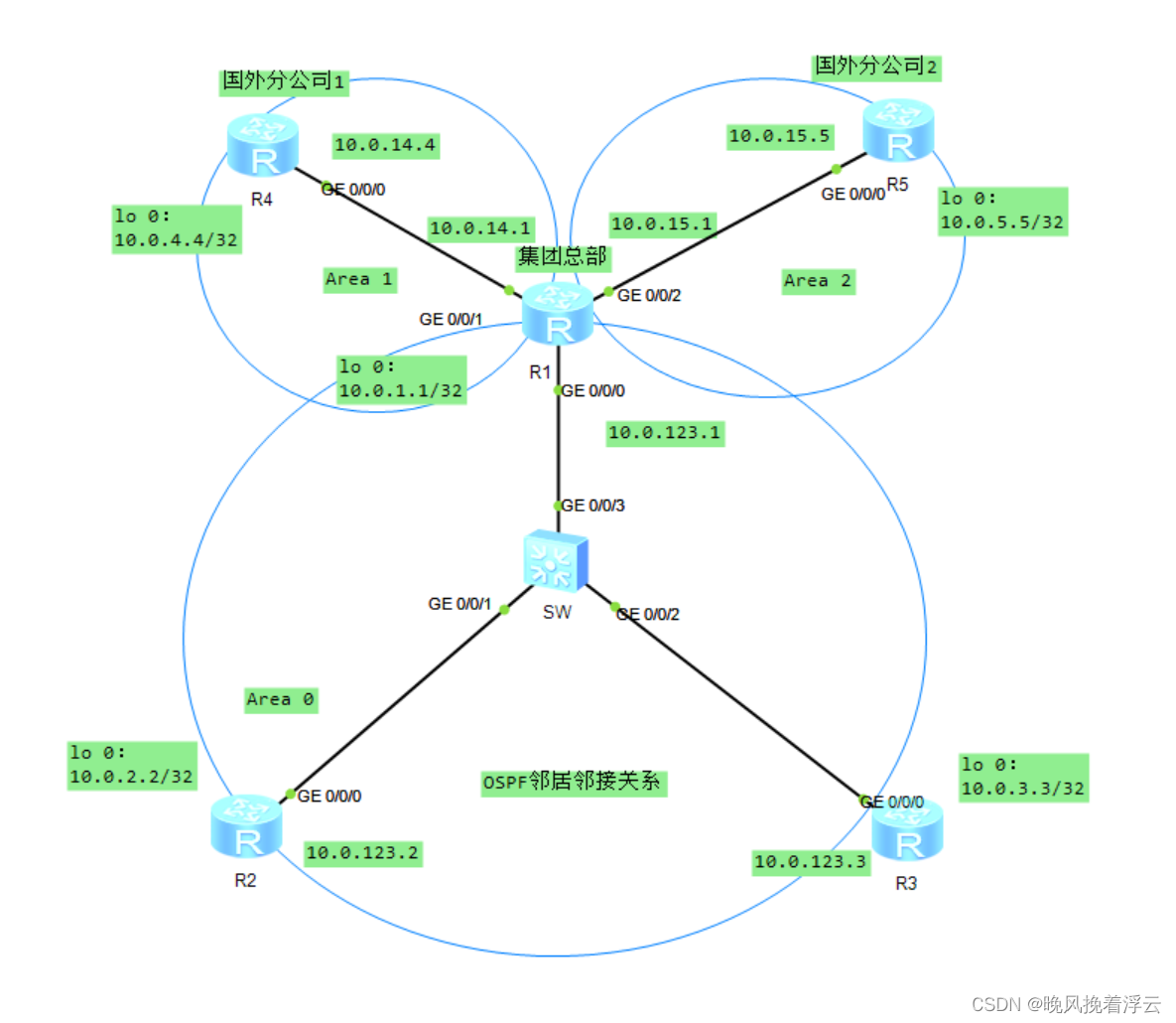 本实验模拟一个跨国企业网络场景,国内集团总部的路由器R1,R2,R3组成一个广播型网络,国外分公司1的路由器R4与国内集团总部核心路由器R1组成了一个点到点网络,国外分公司2的路由器R5与国内集团总部核心路由器R1组成了另一个点到点网络。