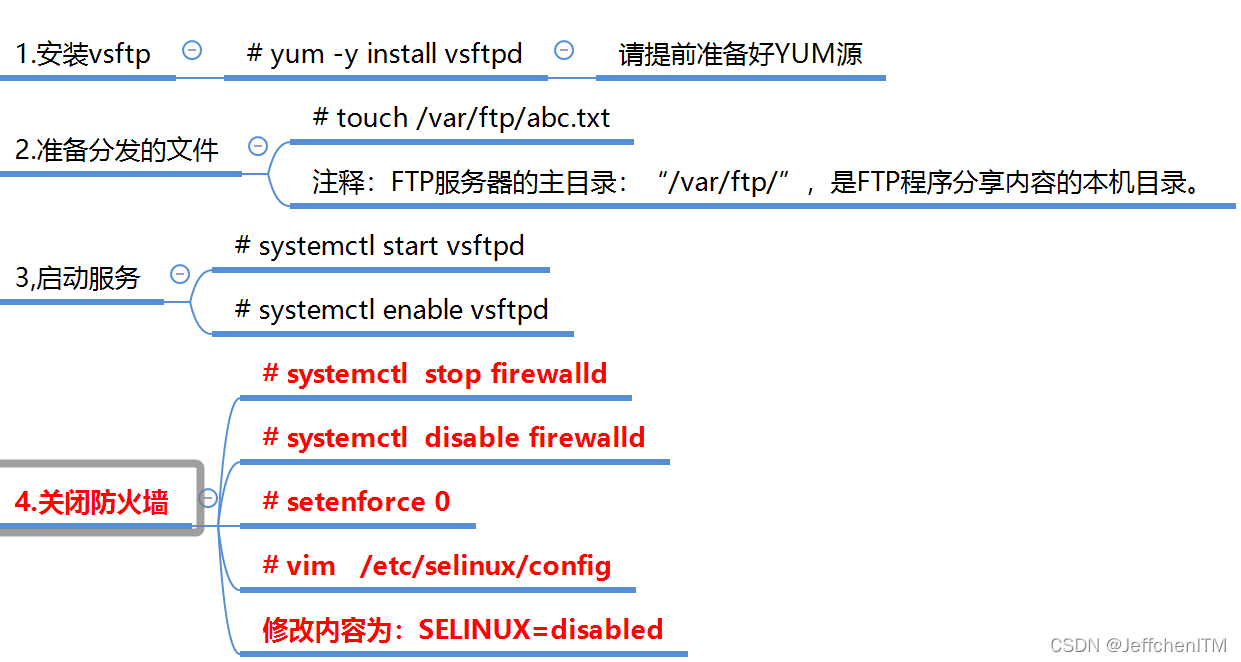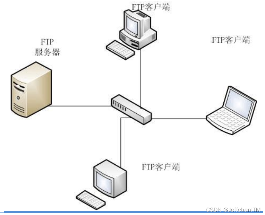 FTP(File Transfer Protocol,文件传输协议) 是 TCP/IP 协议组中应用层的协议之一。FTP软件包为vsftpd,可以提供文件共享服务如下图所示。控制端口为 command 21/tcp 。数据端口为 data 20/tcp。