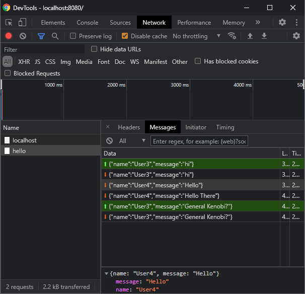 如您所见,一旦连接到服务器,每个页面都会自行获取消息。这可以通过onmessage方法实现。另外,如果你进入 chrome 开发者工具的网络选项卡,你可以看到所有通过 WebSocket 连接发送和接收的消息。