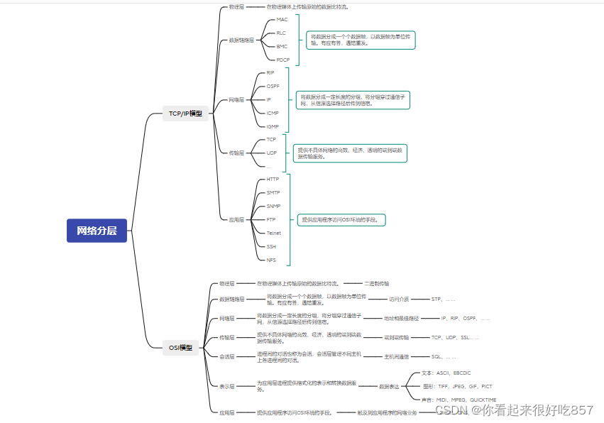 (2)表示层: 文本:ASCII,EBCDIC 图形:TIFF,JPEG,GIF,PICT 声音:MIDI,MPEG,QUICKTIME