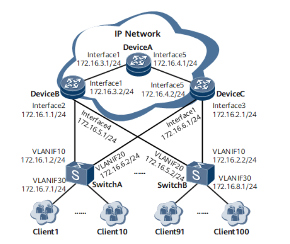 4.在DeviceA、DeviceB和DeviceC上配置动态路由协议。本例选择OSPF动态路由协议。