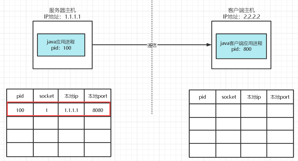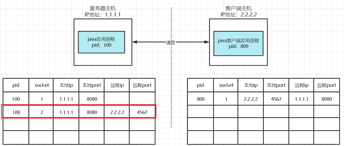6.服务器的tcp层收到数据包后,查看源ip、目的ip、源端口、目的端口,一一对照自己的socket表,发现2号socket真好对应,且得知2号socket是pid为100的应用进程,所以tcp把数据发送给该进程,服务器的java进程解除阻塞,read客户端发送来的数据。