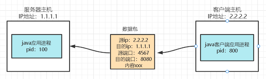 3.客户端发送数据包、目标ip和目标端口给下层的传输层,传输层就能够得到源ip、源端口、目的ip和目的端口,然后一步一步的打包交给下层,发送到服务器主机,服务器主机通过数据包的目的ip和目的端口,对比发现socket对应,然后把数据发送给对应的pid号为100的应用进程。