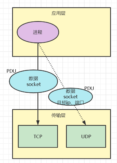 但是想象一下,每次我在应用层发送数据时至少都是需要把要发送的信息、本机ip、本地端口、目的ip和目的端口这五个数据通过层间接口交给传输层(对于TCP协议来说的,UDP无连接不需要应答所以不需要本机ip和端口),如下图