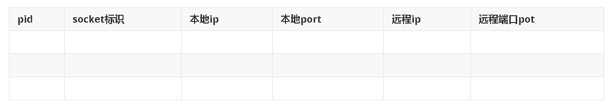 可以得出来socket其实大致就是这么一个6元组(这里省略了socket的状态),当我们应用进程创建socket时,操作系统给该socket一个唯一的整数标识,且肯定是要保存是哪个进程创建的socket,所以pid也应该对应起来,方便日后能给找到对应的进程。