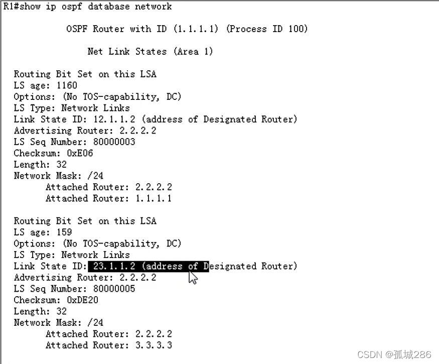 show ip ospf database network可以查看一条网络LSA通告的信息。请注意,和路由器LSA不同,网络LSA中没有度量字段。