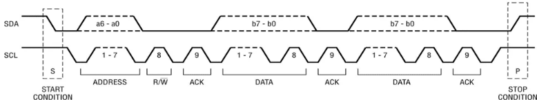 - 读/写位:一位,如果主机是向从机发送数据则为低电平,请求数据则为高电平。