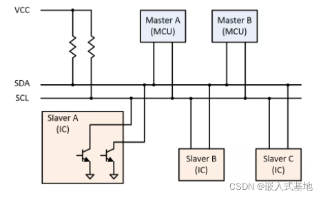 - 每个连接到总线的从机设备都有一个独立的地址,主机可以利用这个地址进行不同设备之间的访问。