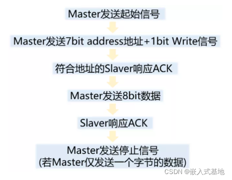 下图以一个主机(Master)给从机(Slaver)写一个字节的数据为例,说明I2C通信的基本协议。