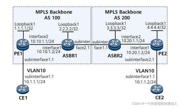 由于VPLS数量较少,因此本示例采用OptionA方式跨域LDP VPLS,ASBR间的接口被当作AC接口与VSI实例绑定,实现CE1与CE2的互通。