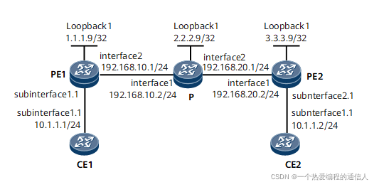 配置OSPF时,注意需要发布PE1、P和PE2的32位Loopback接口地址(LSR-ID)。