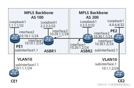 5.在PE1与ASBR1之间、PE2与ASBR2之间配置IBGP对等体,在ASBR1与ASBR2之间配置EBGP对等体,并在ASBR上配置路由策略,对于从本AS的PE接收的路由,在向对端ASBR发布时,分配MPLS标签。对于向本AS的PE发布的路由,如果是带标签的IPv4路由,为其重新分配MPLS标签。
