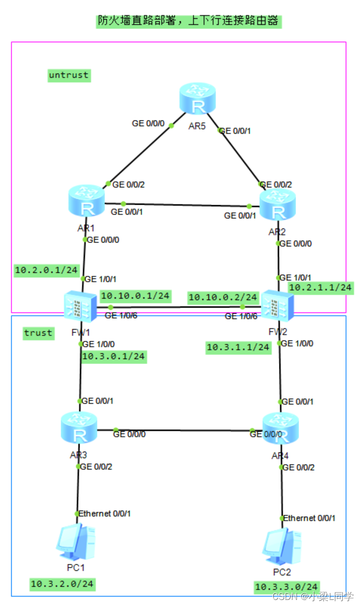 两台FW的业务接口都工作在三层,上下行分别连接路由器。FW与上下行路由器之间运行OSPF协议。现在希望两台FW以主备备份方式工作。正常情况下,流量通过FW_A转发。当FW_A出现故障时,流量通过FW_B转发,保证业务不中断。