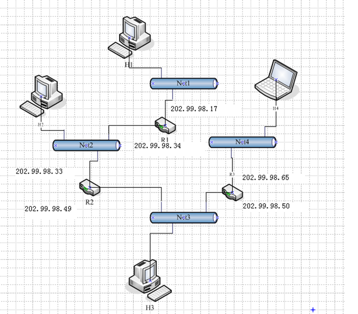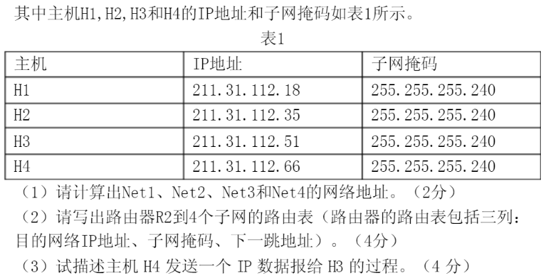 (1)将H1、H2、H3、H4的IP地址分别与它们的掩码进行与操作,可以得到4个子网的网络地址,分别为:202.99.98.16、202.99.98.32、202.99.98.48、202.99.98.64。因此,路由器R1到4个子网的路由表,如表所示。
