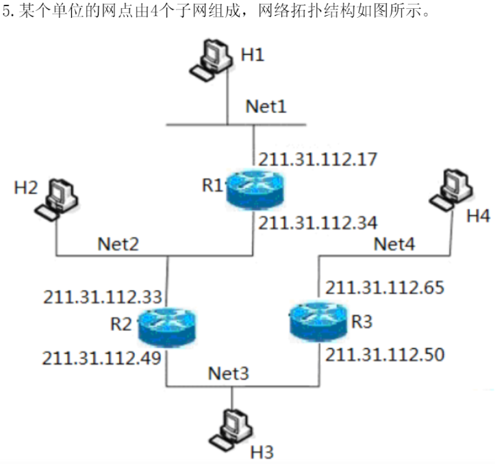 某个单位的网点由4个子网组成,结构如图所示,其中主机H1、H2、H3、H4的IP地址和子网掩码,如表所示。