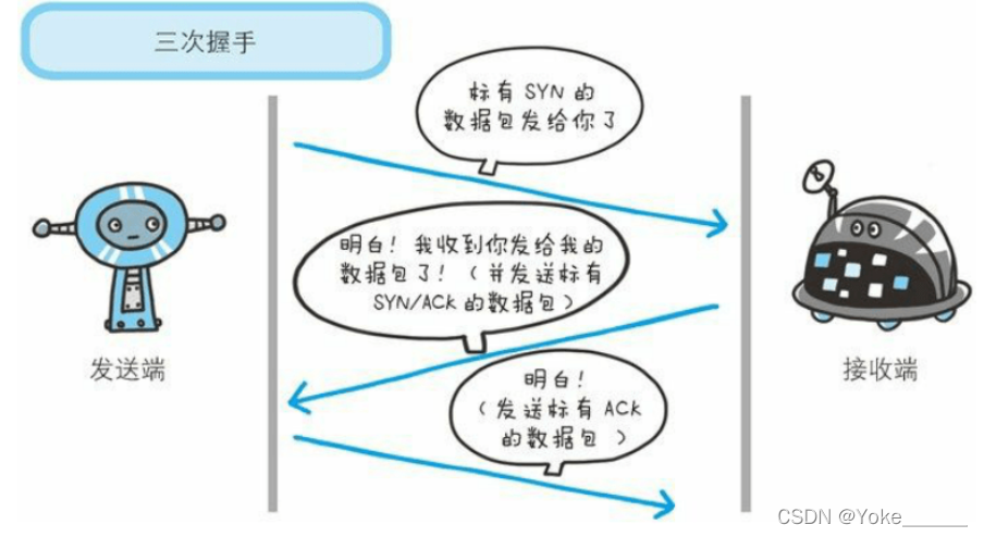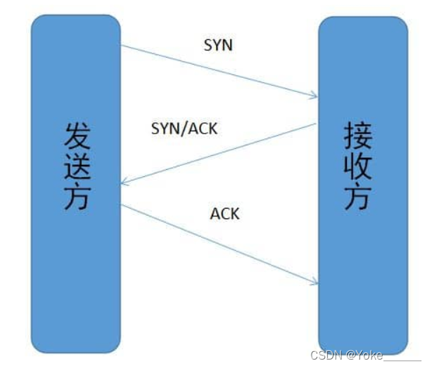 客户端–发送带有 SYN 标志的数据包–一次握手–服务端