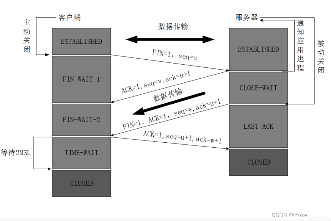 任何一方都可以在数据传送结束后发出连接释放的通知,待对方确认后进入半关闭状态。当另一方也没有数据再发送的时候,则发出连接释放通知,对方确认后就完全关闭了TCP连接。