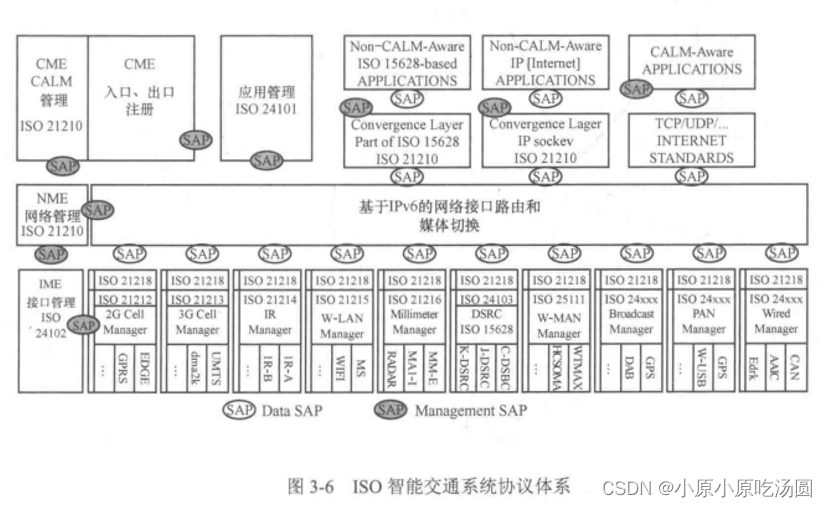 ISO智能交通系统协议体系为跨越多种通信模式和多种传输方法的各种通信场景定义的一套通信协议和空中接口。在该协议体系中,网络层以IPv6为基础,实现了ITS应用业务和通信技术设施的分离。除了IPv6,CALM还支持非IP的网络层技术,例如用于时间敏感的安全快速传递消息的CALM FAST,但是CALM不支持IP和非IP网络之间的异构网络切换。