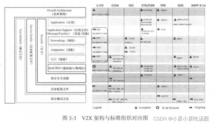 - DSRC协议结构和LTE V2X协议体系结构的示意: