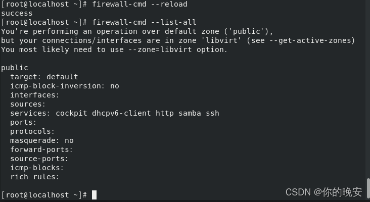 [root@localhost ~]# firewall-cmd --permanent --add-service=samba //添加放行服务samba