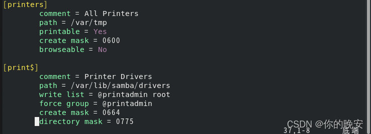 | load printers = yes | #设置在Samba服务启动时是否共享打印机设备 | |