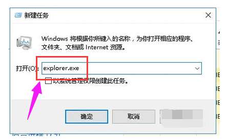 3.在打开一栏中输入explorer.exe,并按下回车。之后屏幕就可以正常显示了。