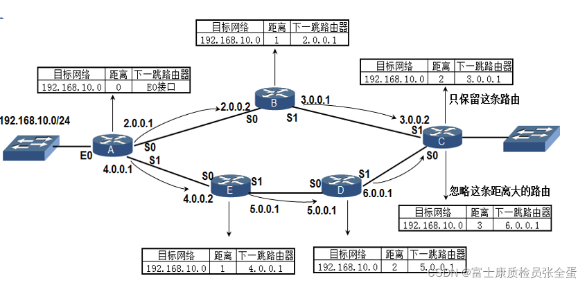 A路由器通过s0和s1接口会将192.168.10.0/24这个网段通告出去,因为A路由器直连这个网段,所以距离是0。通过s0接口告诉B路由器,那么通告的适合距离就得加一,那么B就学到到这个网段的距离是1,同时记录了下一跳,即接口s0 2.0.0.1。