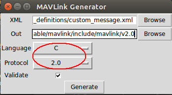 XML文件定位可以直接定位到mavlink/include/mavlink/v2.0/message_definitions/custom_message.xml,Out目录定位到mavlink/include/mavlink/v2.0/common,注意语言选择C,协议选择2.0,如下图所示: