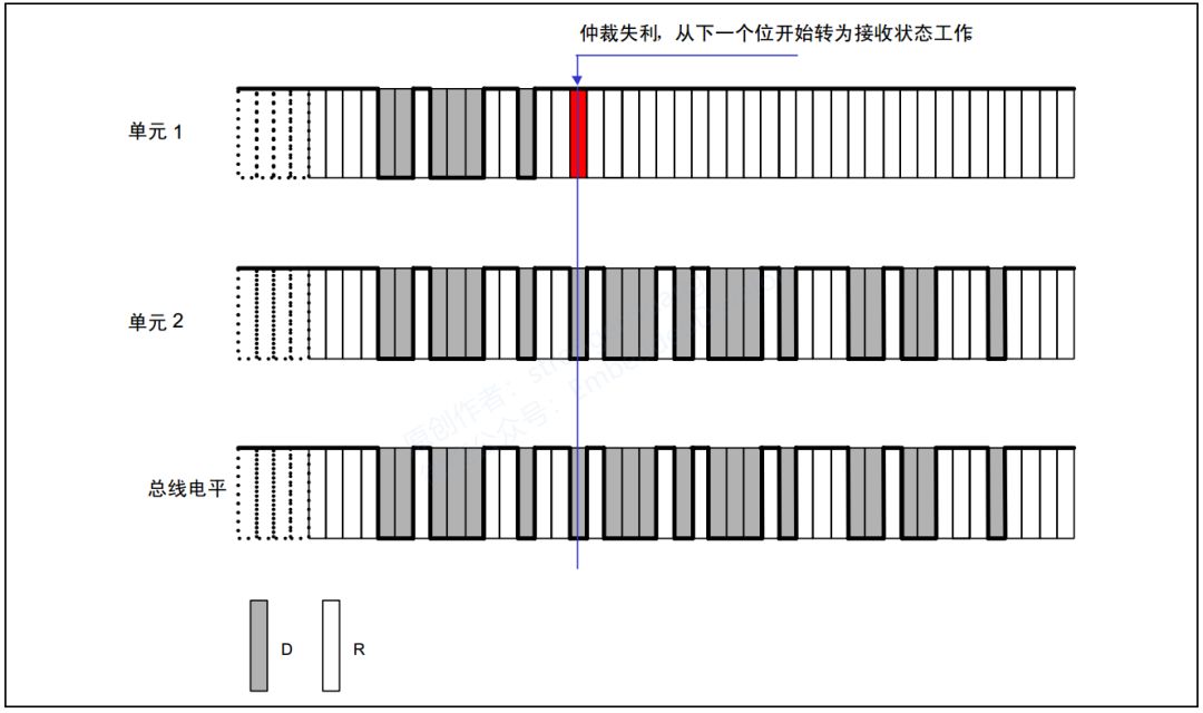 多个单元同时开始发送时,各发送单元从仲裁段的第一位开始进行仲裁。连续输出显性电平最多的单元可继续发送。