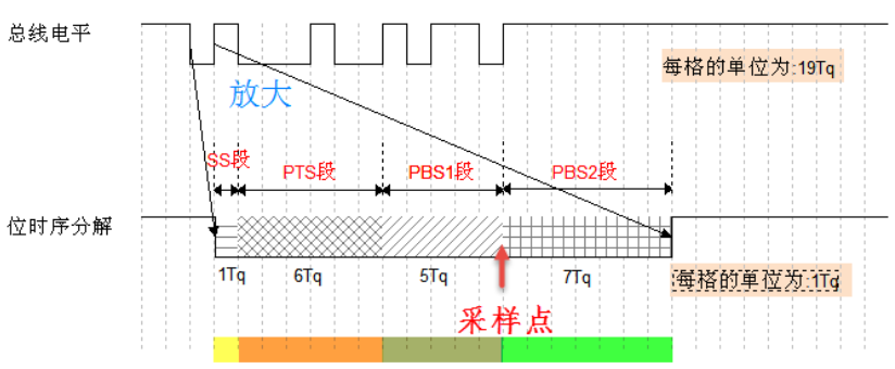 为了实现位同步,CAN协议把每一个数据位的时序分解成如下图所示的4个段。分解后的最小时间单位是Tq,而一个完整的位由8~25个Tq组成。