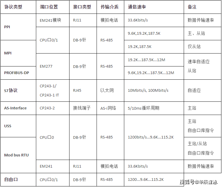 然后我们可以通过一张图片了解西门子 S7-200 PLC支持的几种通讯协议。