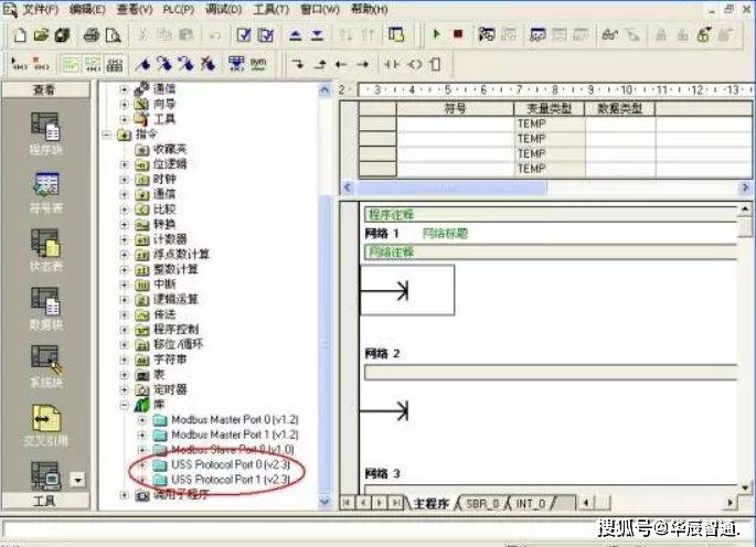 在使用USS协议之前,需要先安装西门子的指令库。USS协议指令在STEP7—MICRO/WIN32指令树的库文件夹中,STEP7—MICRO/WIN32指令库提供14个子程序、3个中断程序和8条指令来支持USS协议。调用一条指令时,将会自动地增加一个或几个子程序。