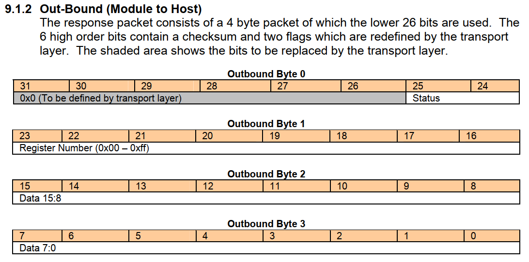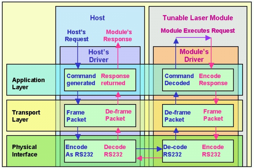 主机TX-》RX光模块,假设主机需要发送请求到光模块,首先主机在应用层生成28bit的命令包(4个字节),开始编码,然后在传输层封装成32bit的的命令帧,最后物理层做四位的校验和,再生成40bit的帧传输。注意,每个字节被RS232传输封装了一个开始和停止位,因此prepending 1位和post-pending 1位总共10位为每个字节被传输,RS232起始位,停止位