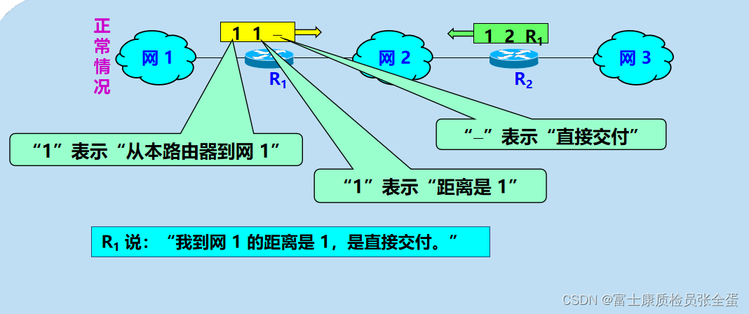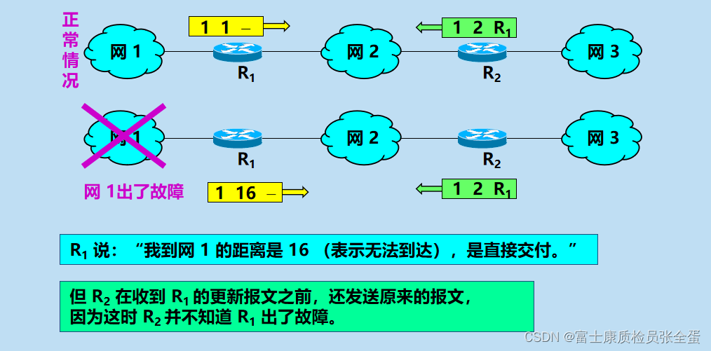 现在这个网段坏掉了,那么网段1就不存在了,如果R1立刻将到1网段的路由删除,出现这种情况了,但是R2路由器上面还有到R2网段需要过两个网段,下一跳是R1,这样会出现什么问题呢?